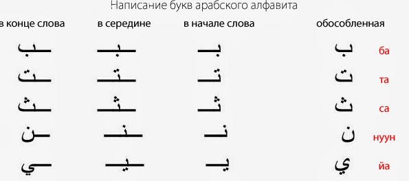 У буквы ب – точка под «волной»; у буквы ت – две точки над «волной»; у ث – три точки над «волной»; у ن – одна точка над слегка сжатой «волной»; у ي – две точки под «волной». Если буква ى пишется без точек – она передает (долгий) гласный звук (а или и , но не й).