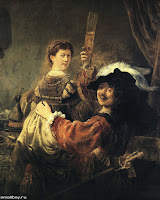 Блудный сын в таверне (Автопортрет с Саскией) в Галерее Старых мастеров, Дрезден – интерпретация притчи о блудном сыне, который растратил состояние отца на беззаботное веселье, алкоголь и женщин легкого поведения. Рембрандт изображает себя усатым молодым человеком, который вызывающе смотрит зрителю в глаза и поднимает тост. Саския в образе проститутки принимает ухаживания посетителя. Она сидит у него на коленях и позволяет обнять за талию.