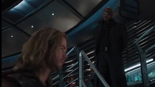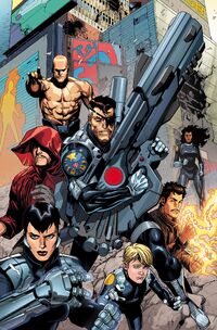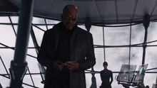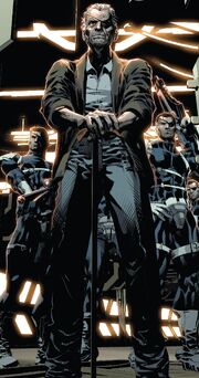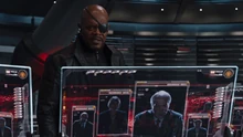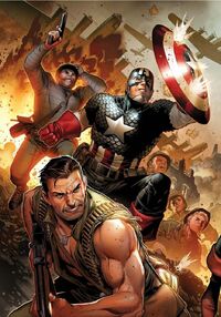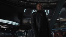 Soon after the attack on Earth, Fury and his new team are seen counter-attacking the Skrull attack in Times Square, Manhattan. They manage to repel and kill the invaders in the area significantly, whilst saving the downed Initiative cadets and the Young Avengers.[30] He, along with his team and the rescued heroes, are next seen working and planning their next move in one of the scattered 28 covert S.H.I.E.L.D. bases.[31] He has been seen talking to Deadpool, while Deadpool was on a Skrull ship after pretending to join them. It is revealed that Fury hired Deadpool to infiltrate Skrull ranks by pretending to defect, with the intention of obtaining biological information of the Skrulls that Fury can use to stop them. When Deadpool attempts to transmit the data, it is intercepted by Norman Osborn.[32]