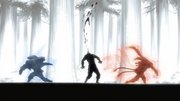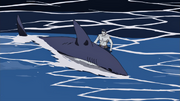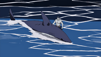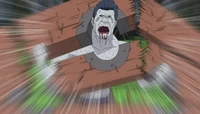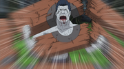 Killer Bee enters a version 2 form and uses his Lariat to destroy Kisame’s entire midsection. Kisame fuses with Samehada to heal his injuries, becoming a monstrous shark-like creature. After trapping Killer Bee, Sabu, and Ponta inside a giant, movable dome of water, he continued his assault on Killer Bee. Bee is forced to throw Sabu and Ponta from the dome to save them from drowning, allowing Kisame to overpower him. He dissipates the dome and moves in to finish the job, but is stopped by Samehada, who protects Bee and gives him some chakra. He kicks Samehada away and prepares to try again.