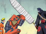Using the chakra he got from Samehada, Bee attacks Kisame. Kisame barely evades the attack and tries to cut off Bee’s legs, but is stopped by the arrival of Bee’s brother: Fourth Raikage. The Raikage and Bee join forces against Kisame and he attempts to use Water Release: Great Shark Missile Technique. Before he can finish the jutsu he is decapitated by their Double Lariat. With his last breath, he states with a grin that their lightning-quick speed was simply too fast for him. His head then flew a distance and landed in front of Sabu.