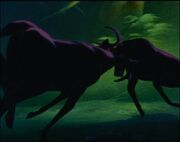 It seems that at the core of Ronno’s disliking of Bambi is jealousy. At some points, he seems jealous of Bambi’s close relationship with the Great Prince of the Forest. At many other points, he is intensely jealous of Bambi’s closeness with Faline, desiring to have her to himself.[2] It was jealousy over Faline’s love of Bambi that led to Ronno and Bambi, now adults, engaging in combat with one another. Bambi proved the victor in the violent battle, and what became of Ronno’s relationship with him afterwards is unknown.[4][1]