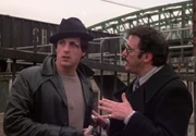 Rocky then quickly starts to beat Tommy without giving him a chance, knocking him down. Rocky tells Tommy that, even though he admires him, he actually ruined their relationship. With Rocky’s back turned, Tommy sucker punches him and starts attacking some of the bystanders on the side. Tommy gains the upper hand and tackles Rocky through a steel door into the street. The two engage in a street fight, which quickly garners the attention of the media, while also catching Robert and Adrian’s attention as well. As the neighborhood gathers round to witness the fight, Tommy’s punches begin to slow Rocky in his tracks due to his condition and he is knocked down, disoriented with Paulie at his side. Tommy is then restrained from finishing Rocky off.