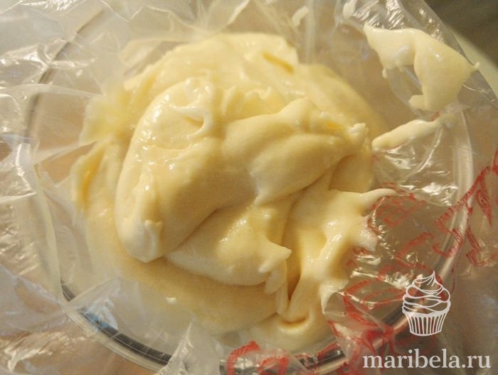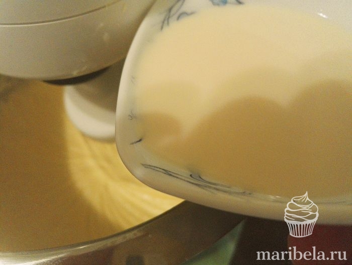 - По столовой ложке добавлять в крем размягченное сливочное масло, не переставая взбивать массу.