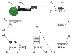 - Радар. Более светлая область представляет угол зрения игрока. На радаре отображаются игроки своей команды, заложники (голубым цветом), бомба (оранжевым), причём объекты отображаются с учётом высоты — точкой или двумя перпендикулярными линиями. Есть возможность отметить игроков (светлооранжевым цветом) командой trackplayer и отменить это действие командой clearplayers.